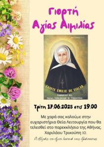 Η Θεία Λειτουργία για την εορτή της Αγίας Αιμιλίας στον Βόλο θα πραγματοποιηθεί στις 17 Ιουνίου 2025, ώρα 8.30 στον Ιερό Ναό Αμιάντου Συλλήψεως της Θεοτόκου, Ρ.Φεραιου-Γαμβέτα