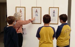 Στη συνέχεια ακολούθησε περιήγηση στον χώρο όπου εκτίθενται τα 40 έργα του ζωγράφου Γιάννη Μυλωνά που αναδεικνύουν την ευζωνική στολή και οι σημαίες της Επανάστασης.