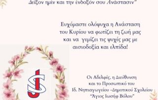 Με πολλή αγάπη οι εκπαιδευτικοί του Σχολείου μας μίλησαν με τα παιδιά μας για τη μεγάλη γιορτή της αγάπης, το Πάσχα. Τα συγκλονιστικά γεγονότα των Παθών, της Σταύρωσης και της Ανάστασης ακολούθησε η γνωριμία με τα πασχαλινά έθιμα. Το τραγούδι του Λαζάρου, τα κουλουράκια, τα καλαθάκια γέμισαν με χαρά όλους, [...]