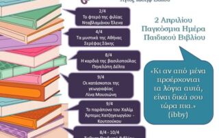 Με αφορμή την Παγκόσμια Ημέρα Παιδικού Βιβλίου, στο σχολείο μας θα πραγματοποιηθούν οι παρακάτω δράσεις: Τρίτη 2/4 : "Το φτερό της φιλίας", Έλενα Νταβλαμάνου Παρουσίαση βιβλίου και δράσεις με τους μαθητές του Νηπιαγωγείου και της Α' τάξης. Παρασκευή 4/4 : "Τα μυστικά της Αθήνας" - "Τι λες κι εσύ, κυρ [...]