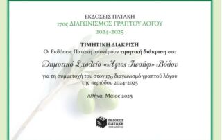 Μαθητές και μαθήτριες του Σχολείου μας συμμετείχαν στον 17ο Διαγωνισμό Γραπτού Λόγου από τις Εκδόσεις Πατάκη. Οι μαθητές κλήθηκαν να συγγράψουν ένα κείμενο προσωπικό, αυθόρμητο και ειλικρινές, εκφράζοντας τις σκέψεις, τα συναισθήματα και τις εμπειρίες τους πάνω σε ένα πραγματικό ή φανταστικό περιστατικό. Το Σχολείο μας έλαβε τιμητική διάκριση!!! Συγχαρητήρια [...]