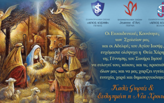 Οι εκπαιδευτικές κοινότητες των σχολείων μας και οι αδελφές του Αγίου Ιωσήφ, ευχόμαστε ολόψυχα η Θεία Χάρη της Γέννησης του Σωτήρα Ιησού να ευλογεί τους κόπους και τις προσπάθειες όλων μας και να μας χαρίζει υγεία, ευτυχία, χαρά και δημιουργικότητα.