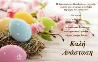 Η Ανάσταση του Θεανθρώπου να χαρίζει ελπίδα και να γεμίζει αισιοδοξία τις ψυχές των ανθρώπων. Με αγάπη Οι αδελφές και η Εκπαιδευτική κοινότητα του Δημοτικού Σχολείου > Βόλου.