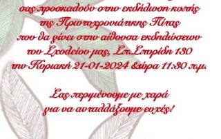 Με χαρα ο Σύλλογος Γονέων του Σχολείου μας σας προσκαλεί στον Αποκριάτικο Χορό του που θα πραγματοποιηθεί την Κυριακή 25 Φεβρουαρίου 2024...